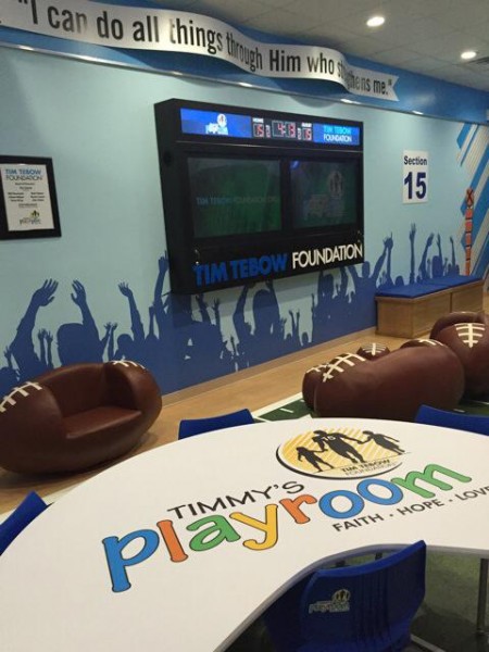 Timmy’s Playrooms are part of the Tim Tebow Foundation, and are ‘being built in children’s hospitals around the world to bring Faith, Hope and Love to patients and their families. These rooms provide an atmosphere that allows the children to take their minds off their medical treatment and just be kids again.’