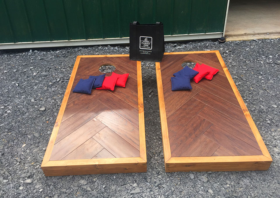 Allwein Carpet One Floor & Home made corn hole boards as a housewarming gift for Timothy and Kelly from hardwood floors that were used in the home.