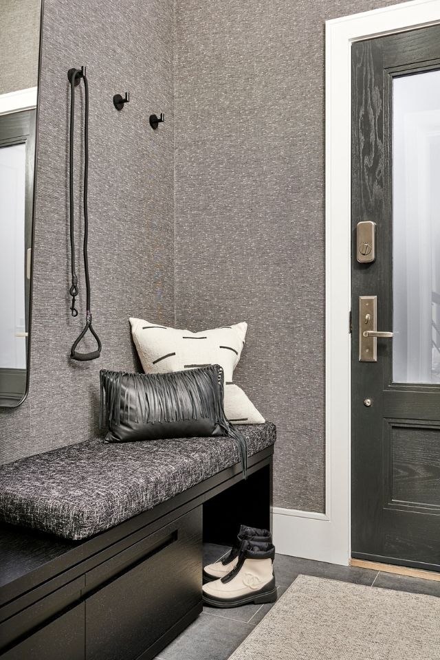 This entryway is unlike other entryways thanks to its unique shape. While the hall tree makes for a great place for shoes and other items that need to be stored, the hallway serves as a space that takes on the perfect area rug. Because the area is much wider than it is long, Rebecca Hay opted for a rectangular jute entryway rug rather than a runner. This is just one of the many ways a rectangular rug can be styled in an entryway.