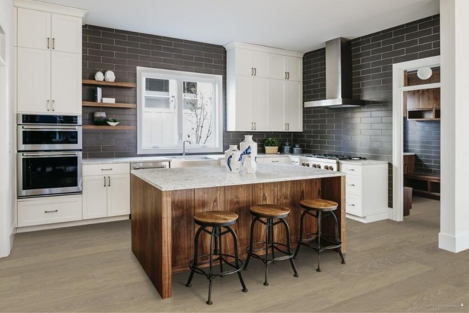 Hardwood flooring is a must-have for achieving the perfect farmhouse look. Natural wood brings warmth, character, and timeless elegance to any space, making it an ideal choice for farmhouse-style homes. For a truly authentic feel, consider wide-plank hardwood floors with a medium brown or slightly warm tone. White oak is especially popular due to its natural knots and distinct grain patterns, which add charm and texture to your flooring. These features not only enhance the modern farmhouse aesthetic but also create a seamless flow throughout your home, including the kitchen. By choosing durable, high-quality hardwood, you’ll enjoy a practical and beautiful foundation that withstands the test of time.